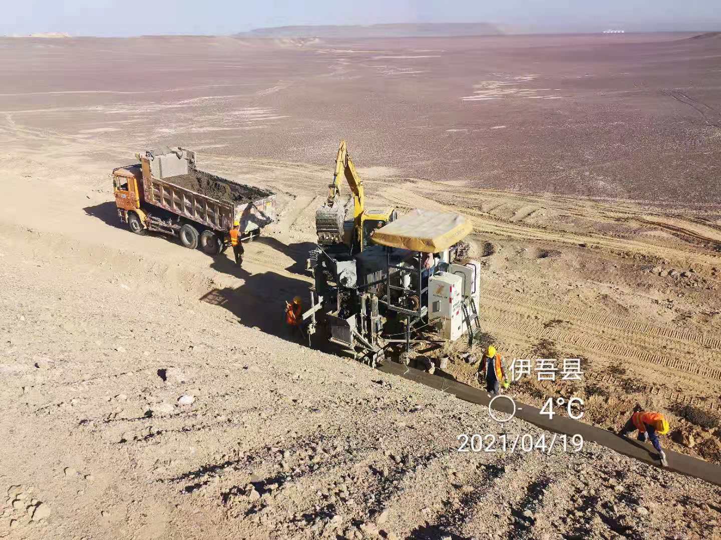 新疆哈密地區(qū)地理位置特殊,尤其是距離市區(qū)一百多公里外的戈壁灘上更是炎熱,地面溫度最高時達到了57℃。再加上戈壁灘的風(fēng)大沙大,無疑給在這里奮斗的工程施工人員帶來了巨大的挑戰(zhàn)。為快速推進施工進度、堅定不移完成年度施工目標,新路緣公司積極貫徹中交一公局施工精神,科學(xué)組織施工,攻克難關(guān),保證施工有序進行。